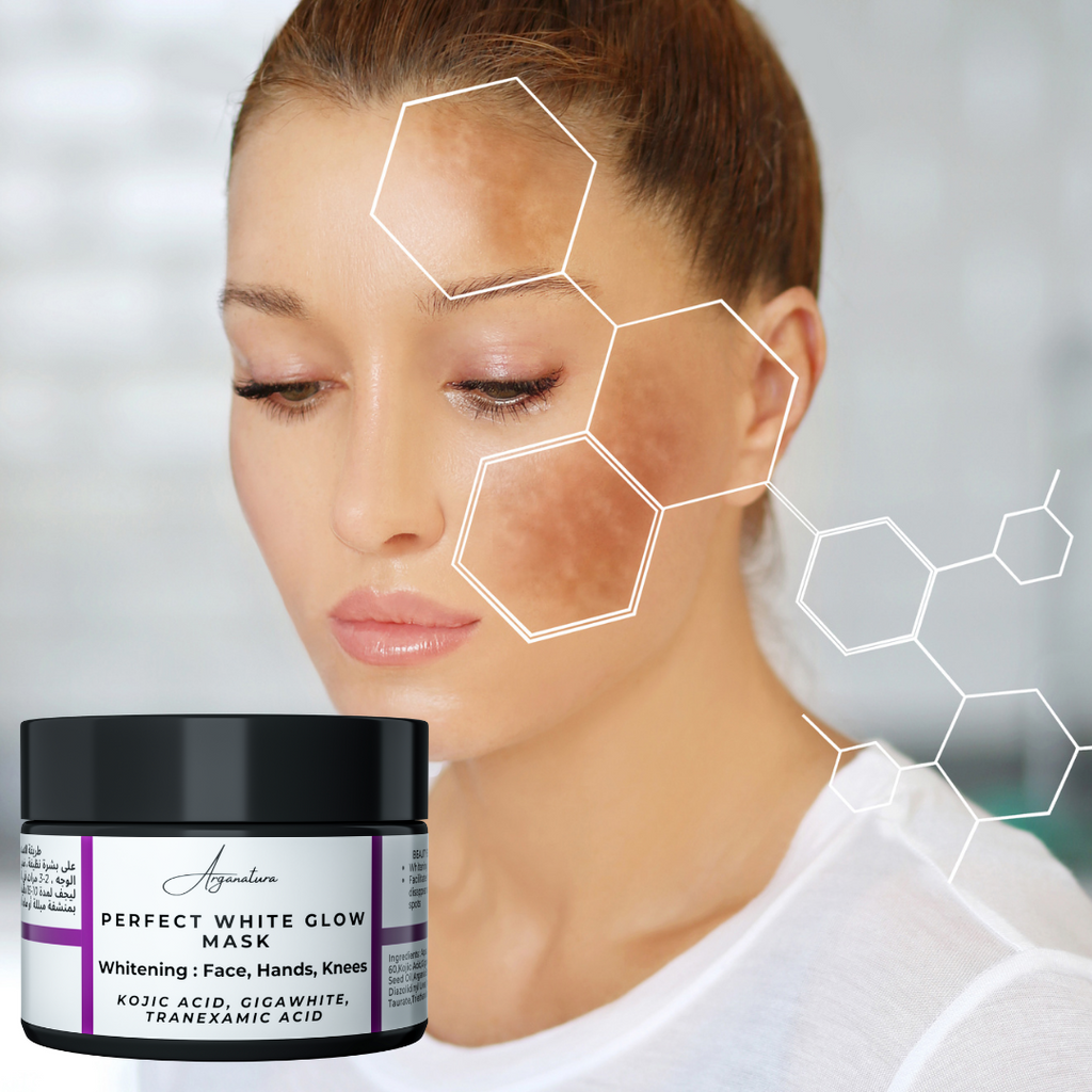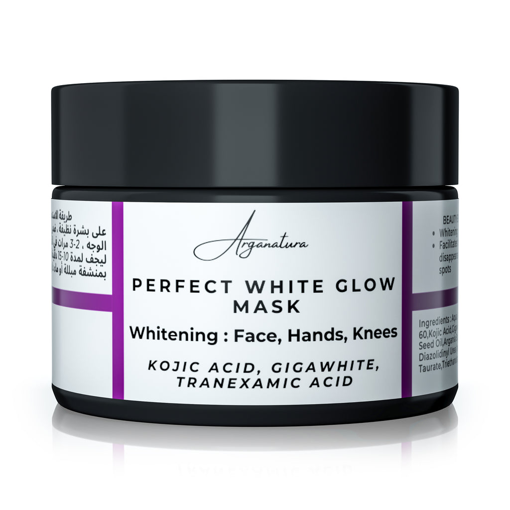 The Perfect white glow mask is formulated with an efficacious blend of tranexamic acid, kojic acid, Gigawhite to target the look of Post-inflammatory hyperpigmentation (PIH) for a brighter, more even looking complexion. Ideal for all skin types and tones.